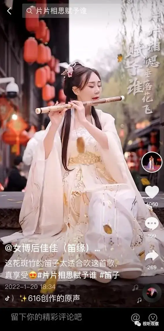 视听观察也在抖音发现了很多优质的内容,如下图女博士佳佳就是吹奏笛子的高手。